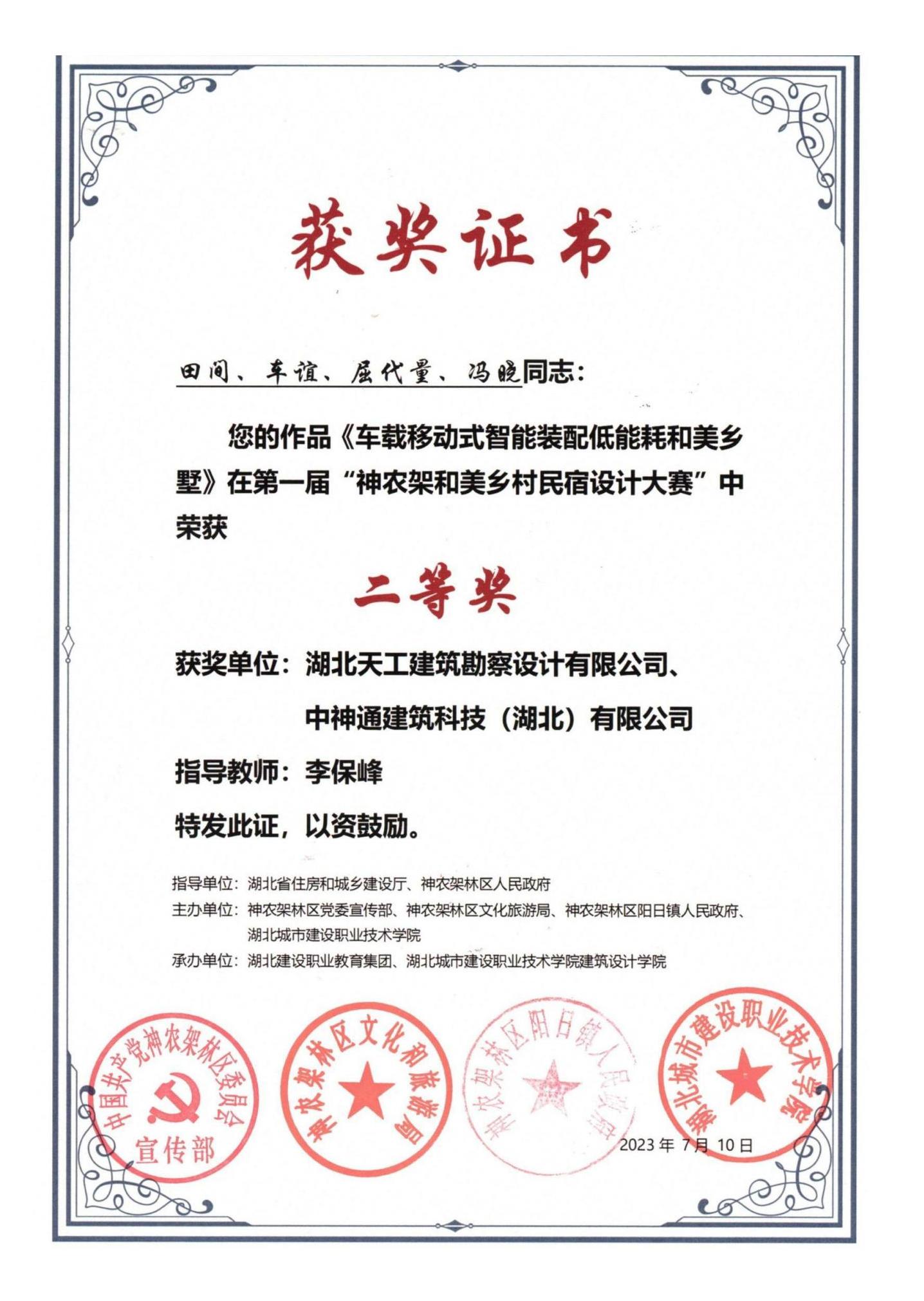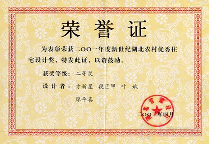 “二〇〇一年度新世紀湖北農村優秀住宅設計獎”榮譽證