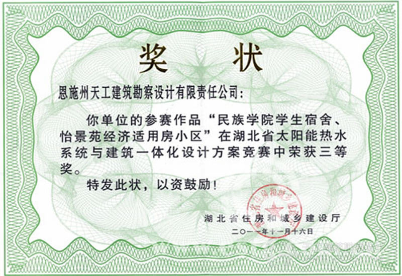 湖北省太陽能熱水系統與建筑一體化設計方案競賽獎狀