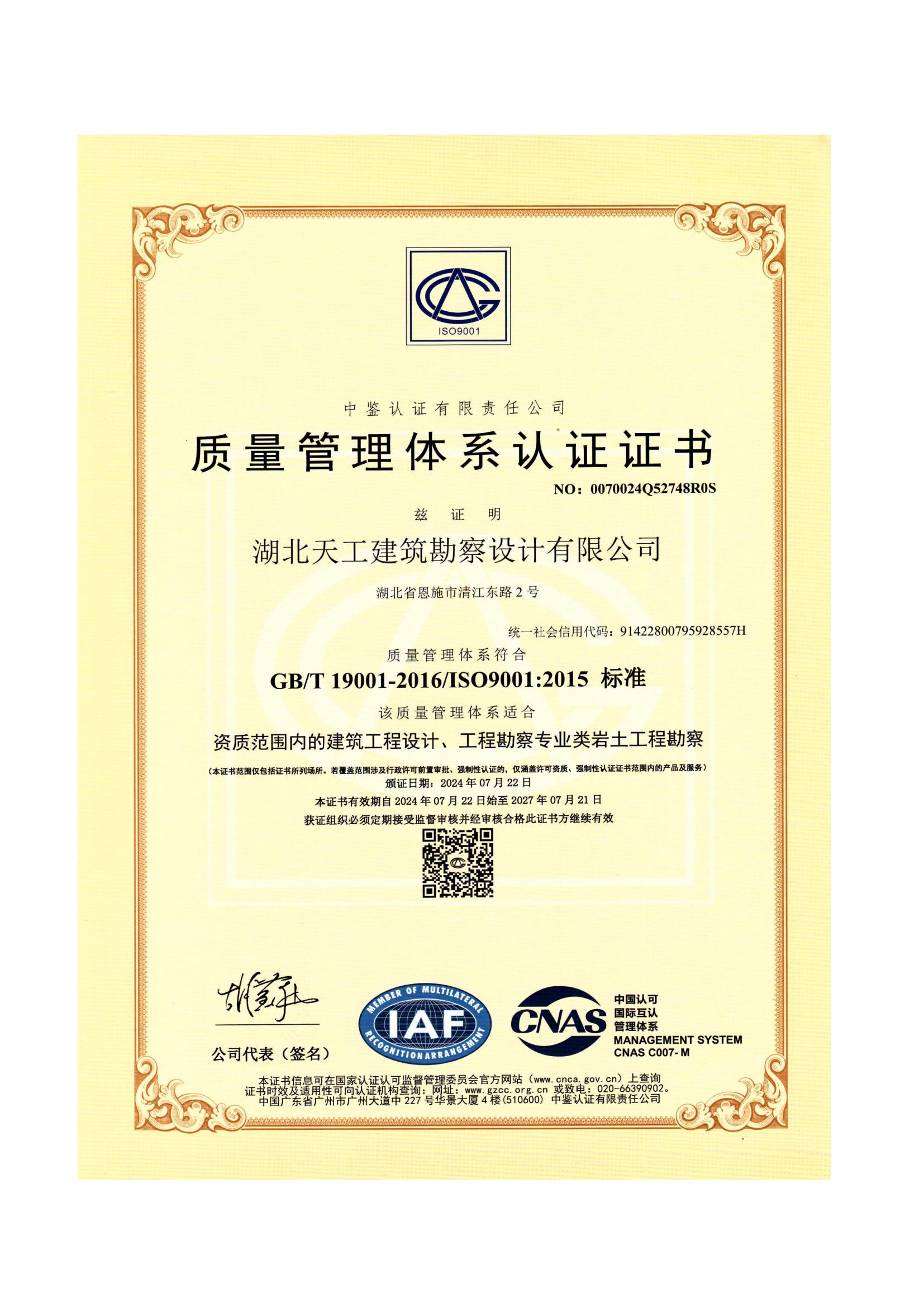 質量管理體系認證證書